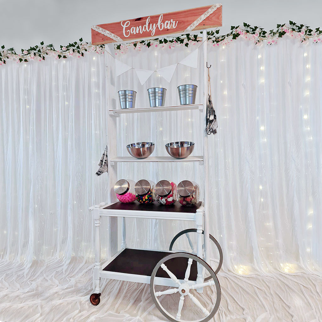Unsere Candybar als Highlight für Ihre Feier. Die Candybar wird mit folgender Ausstattung bereitgestellt.